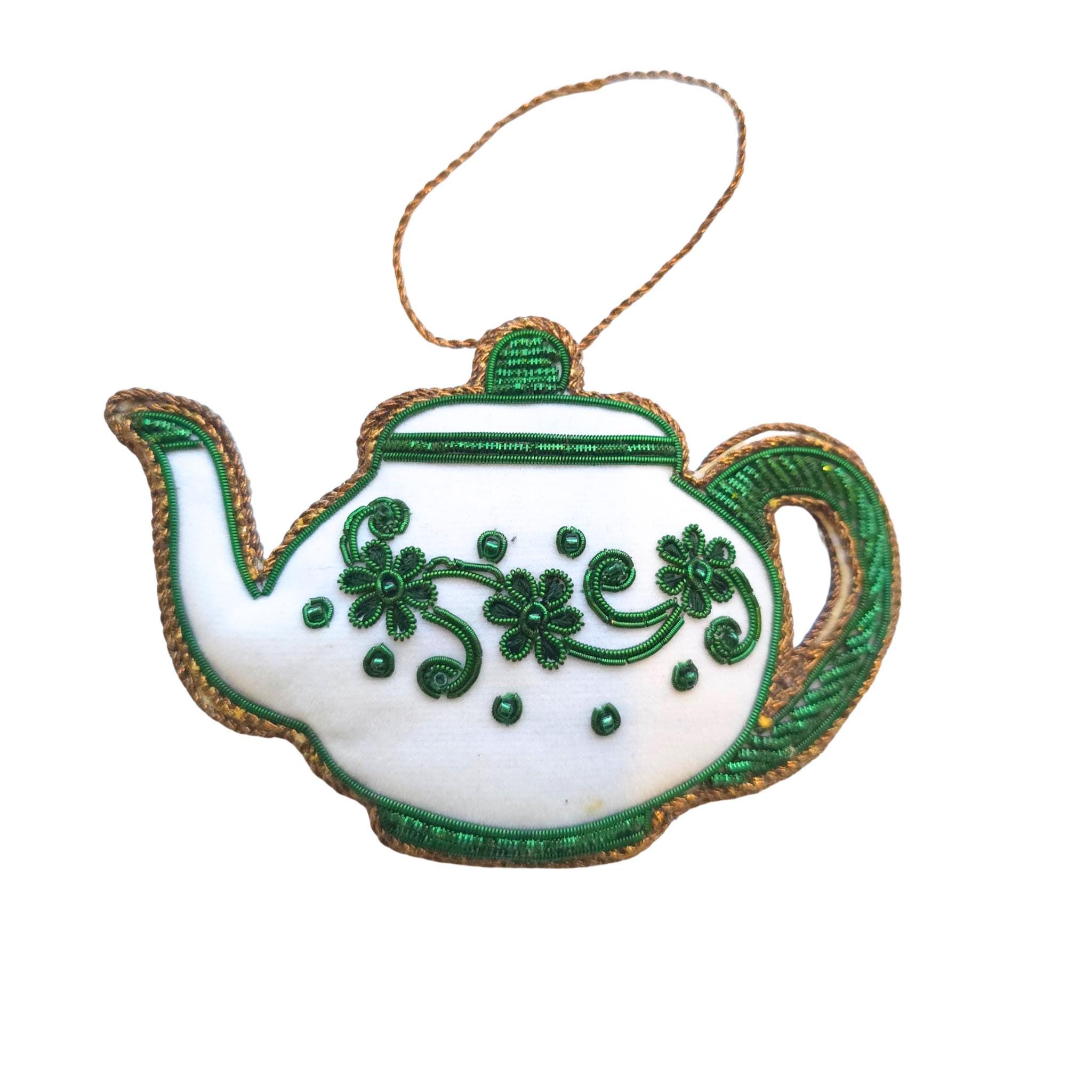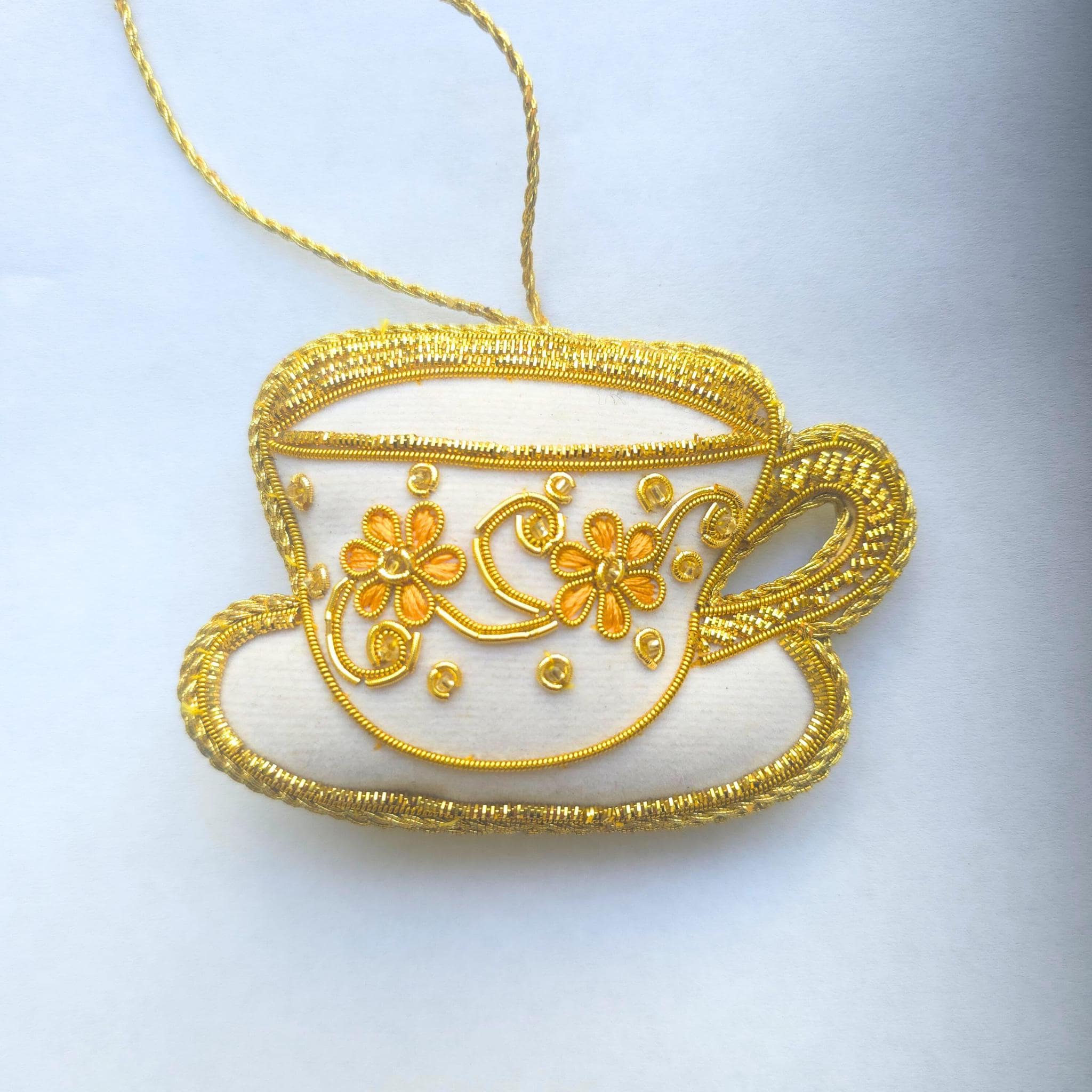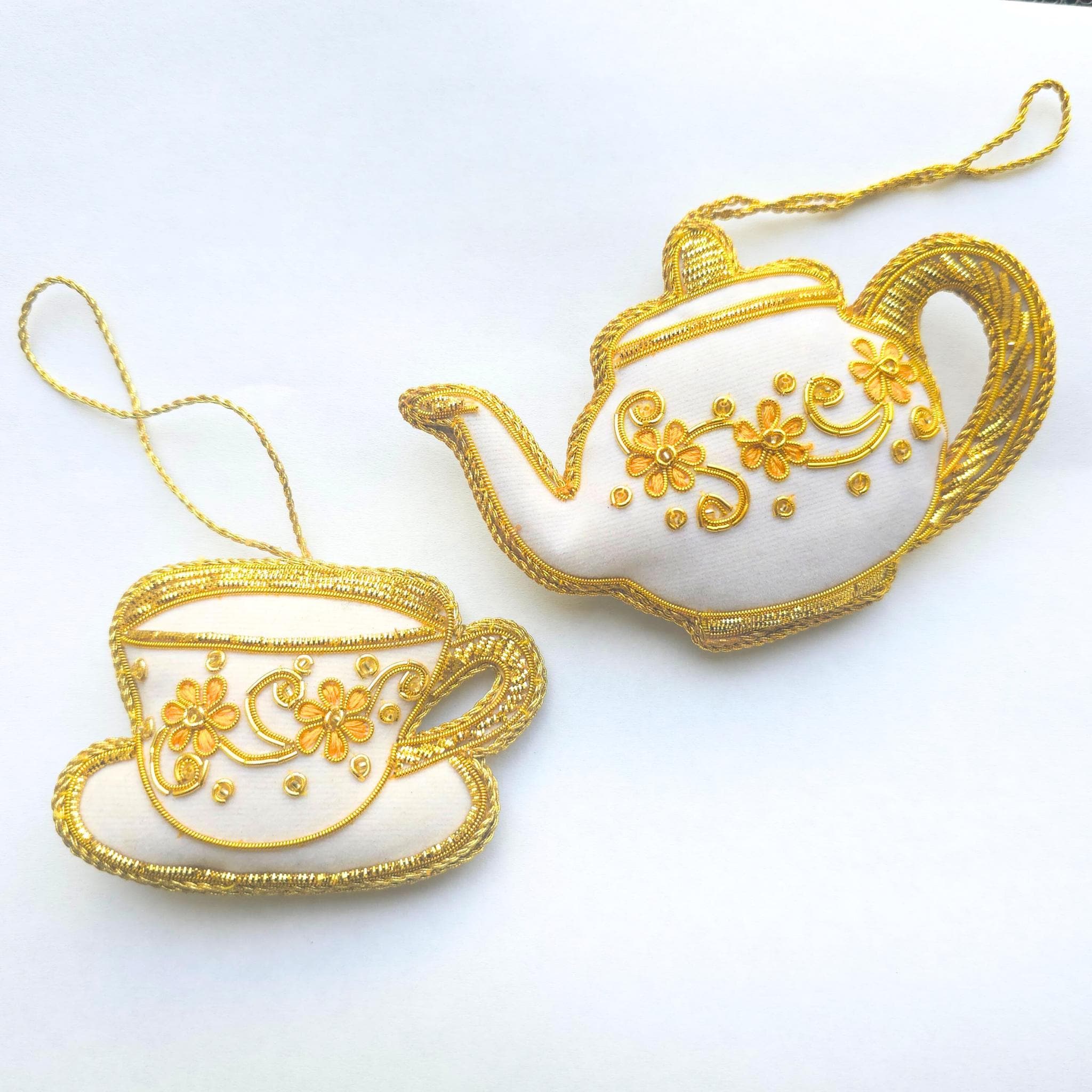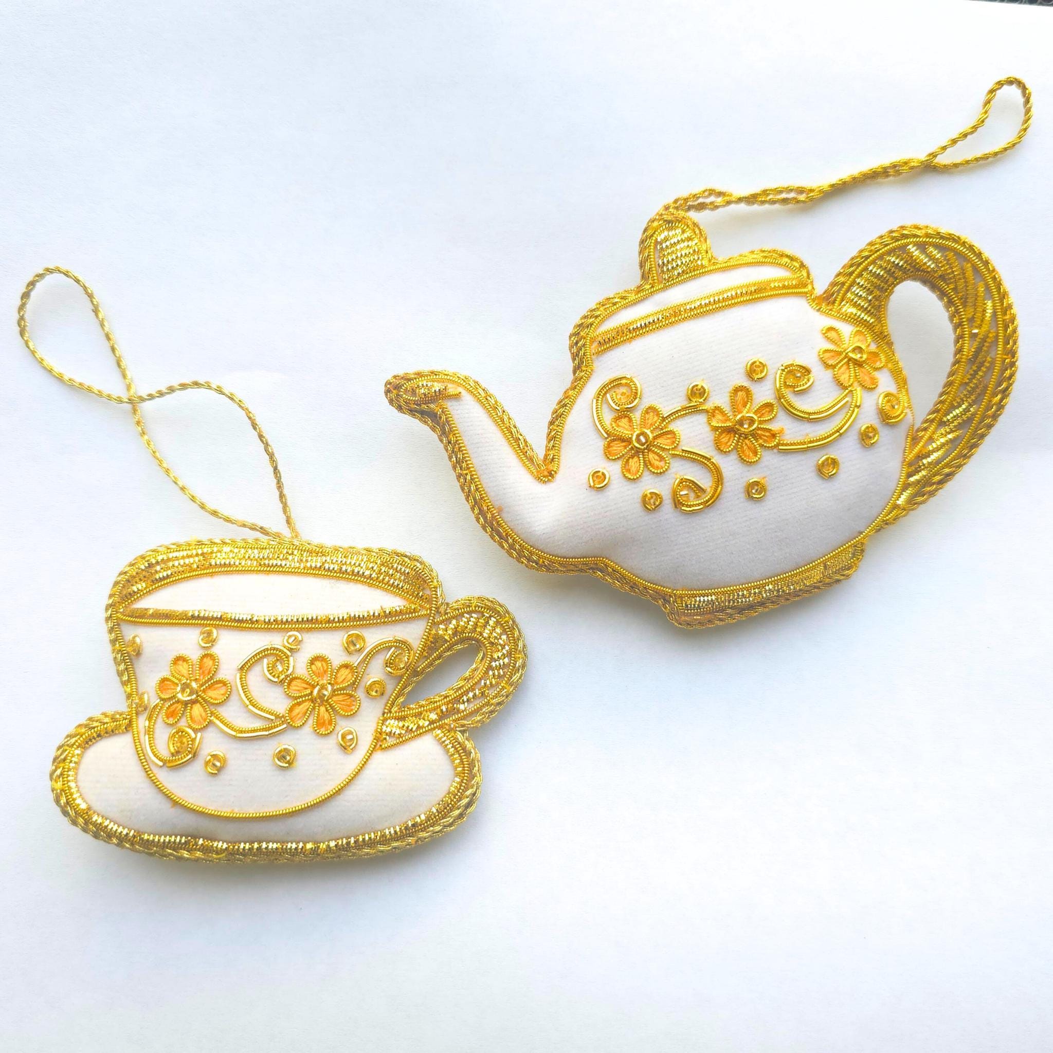 Handmade Embroidered Teapot & Teacup Christmas Ornament: Gold Floral Decor