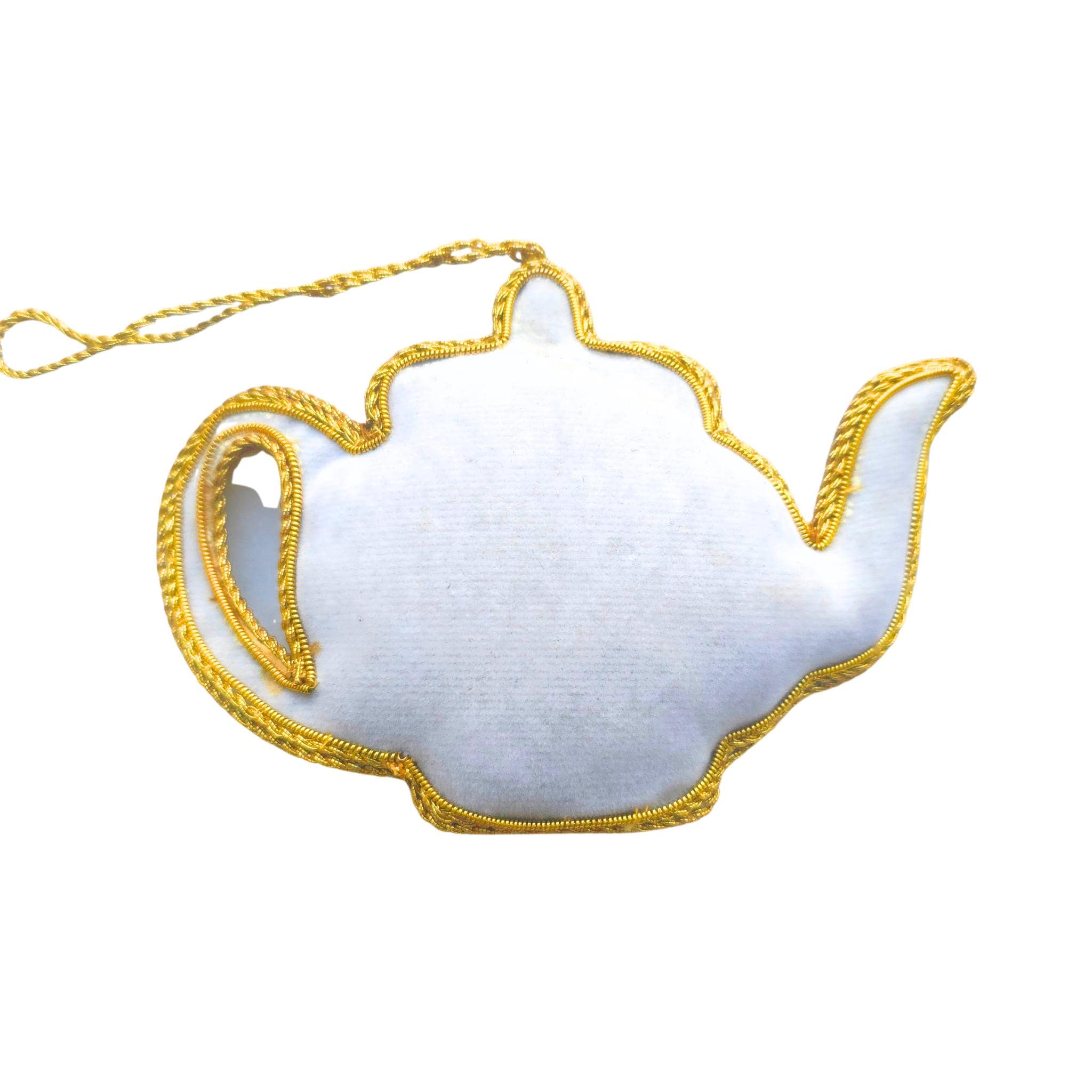 Invite your friends to a tea party! Send out an invitation that includes this exquisite, elegant white velvet teapot and tea cup hanging holiday ornament, hand embroidered with glittery gold scrolling flowers. Perfect gift for a tea lover or a special memento of a Mother Daughter tea. Add it to a Christmas basket full of tea and tea accessories. Use it as a gift tag.