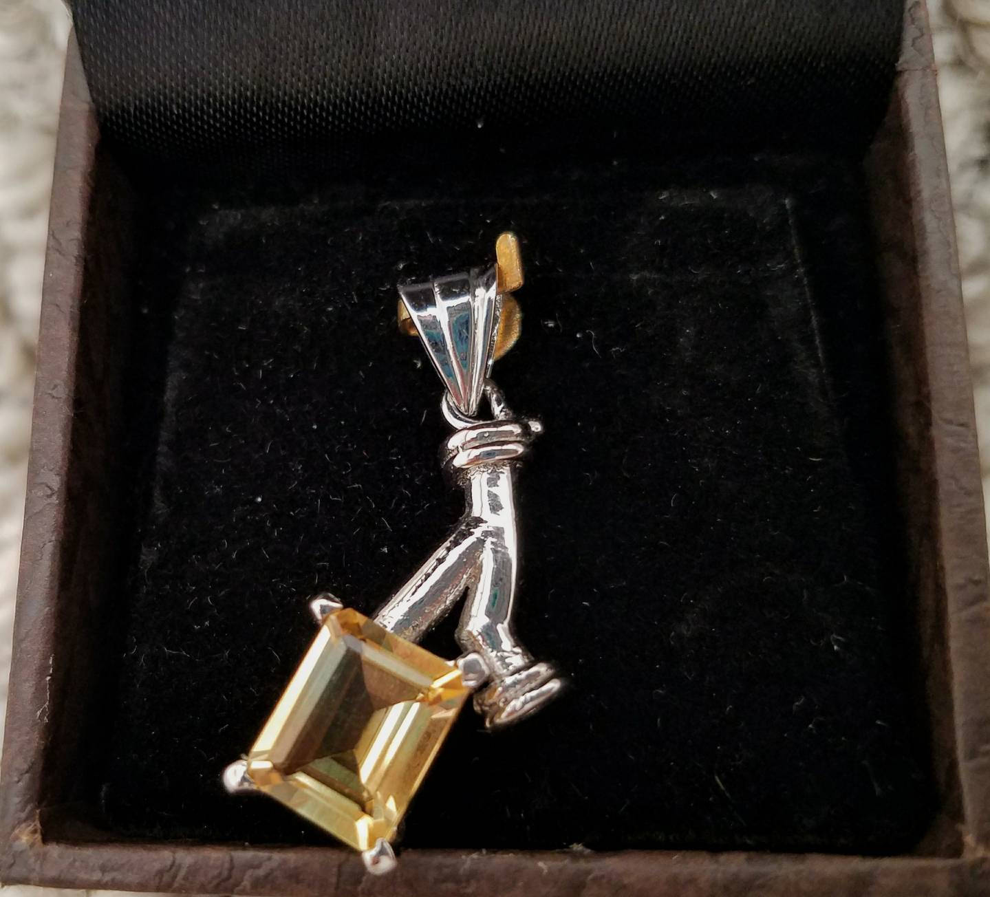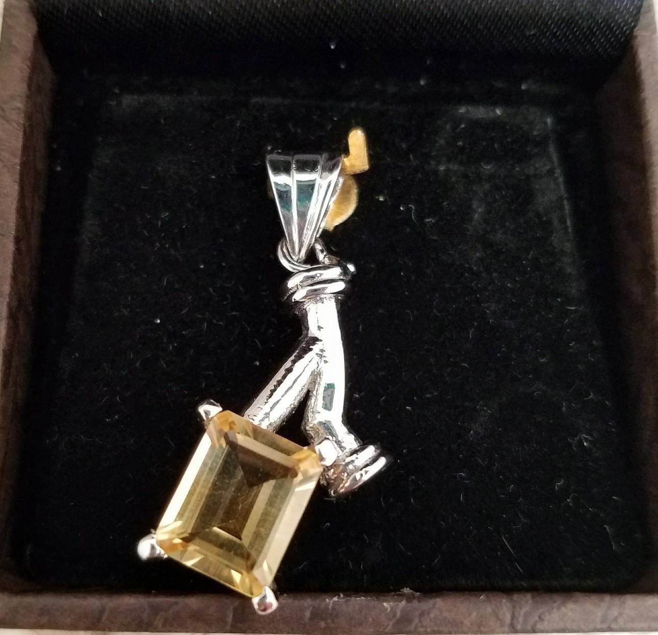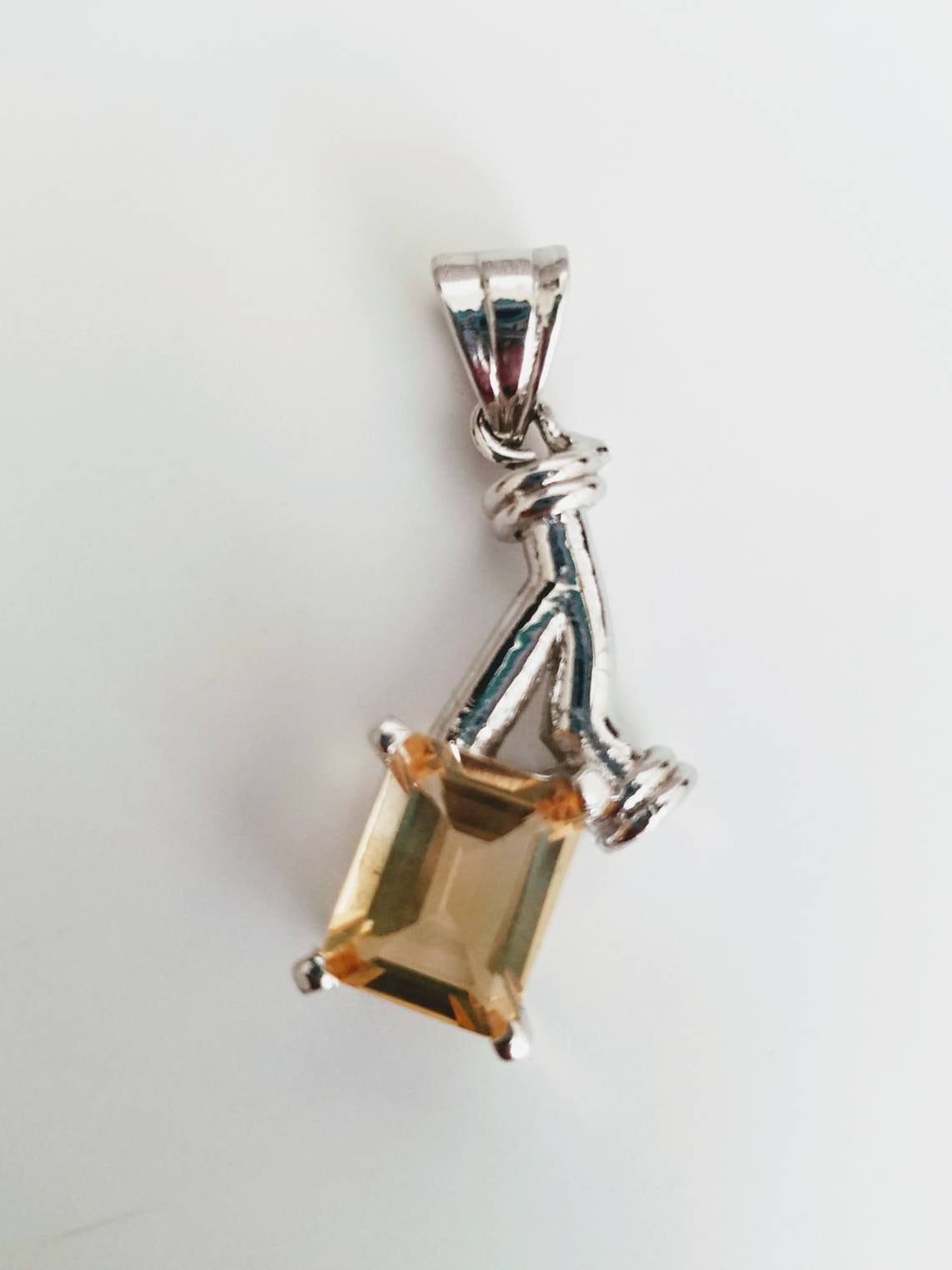 - Beautiful emerald cut pendant in a saturated clear yellow topaz. 3.0 ct. Like sunshine. Stone is expertly cut and polished to a bright shine. It is a very clear stone. Measures approximately 1 1/4 in total top to bottom. Width of 1/4 in.