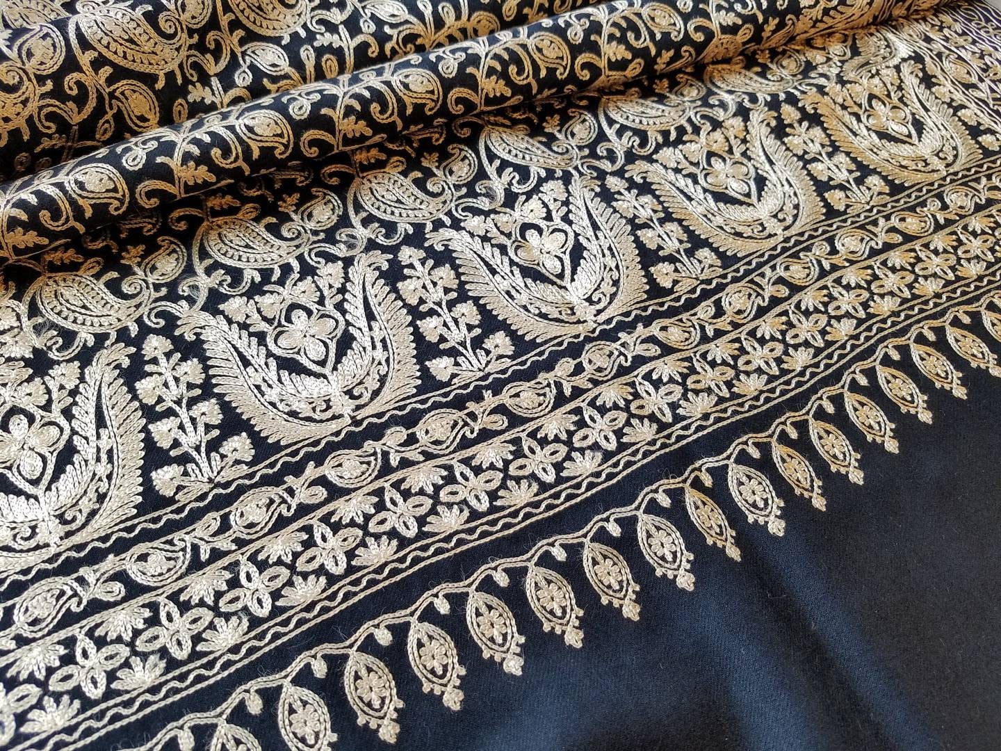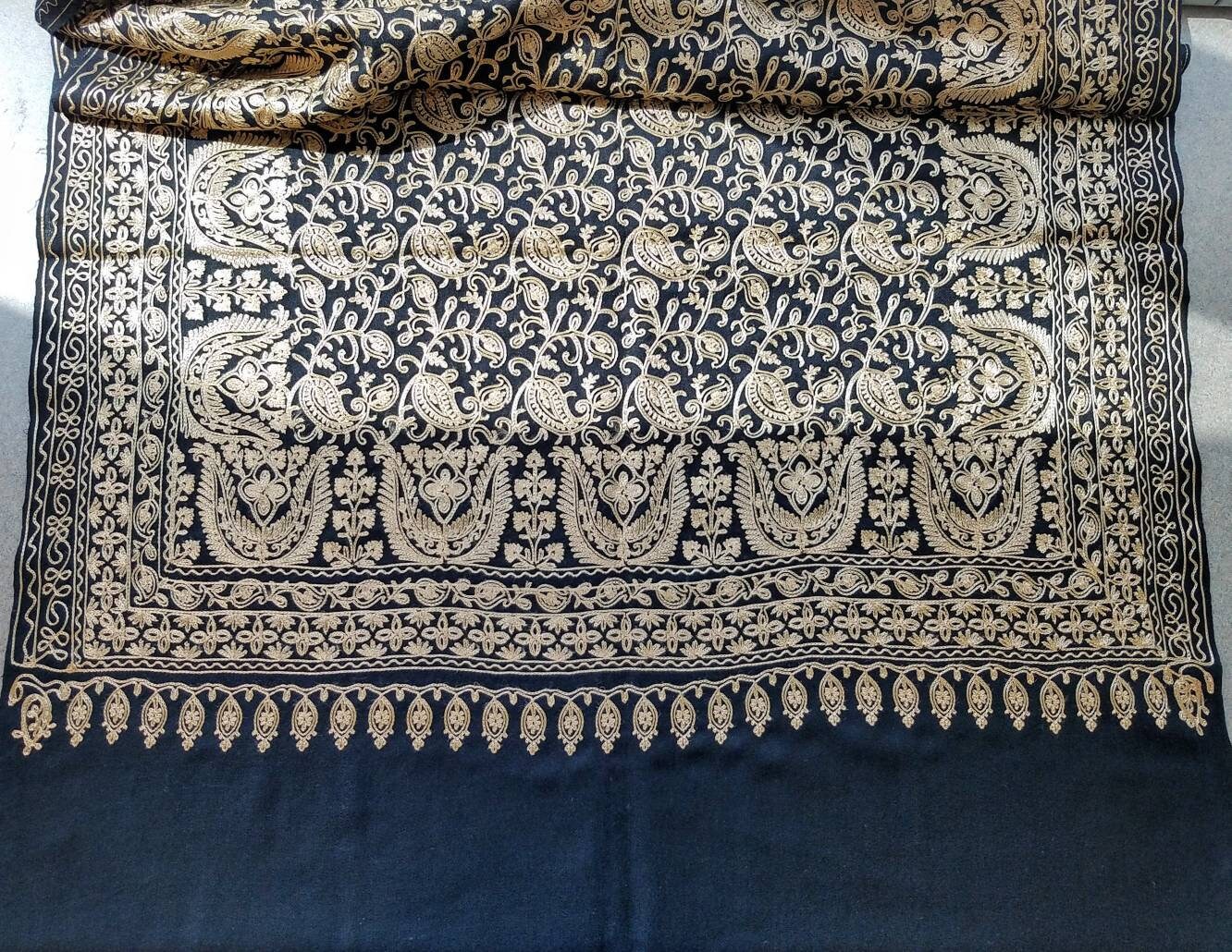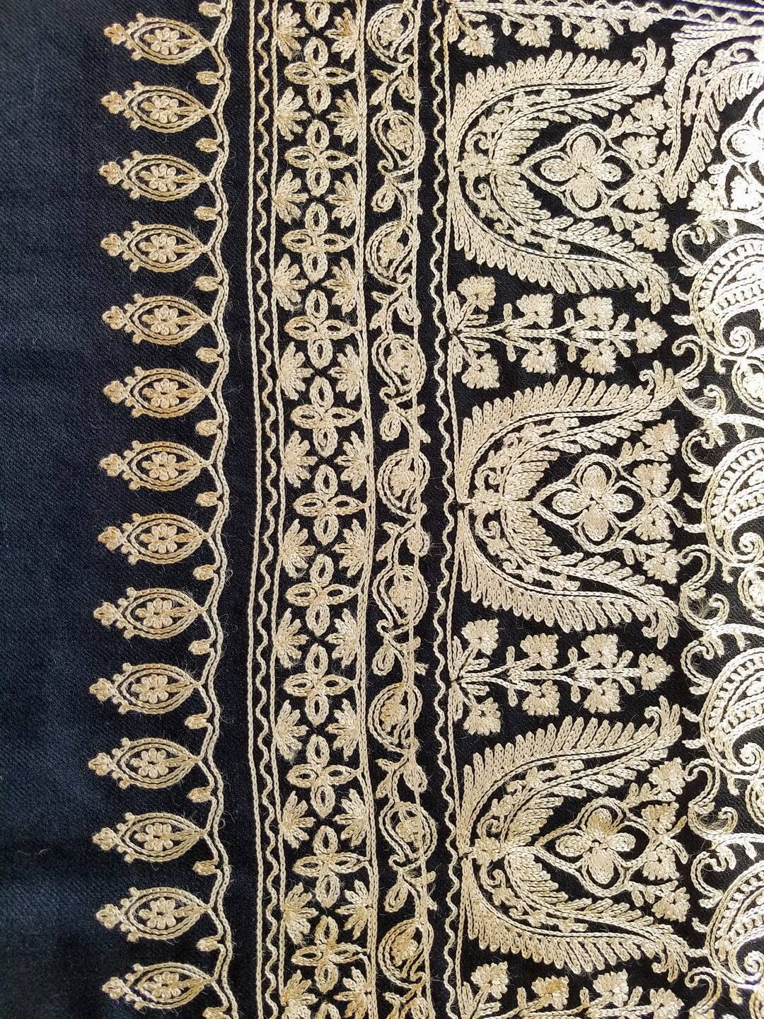 Look stunning in this elegant black wool shawl with golden beige paisley embroidery, all over pattern.
